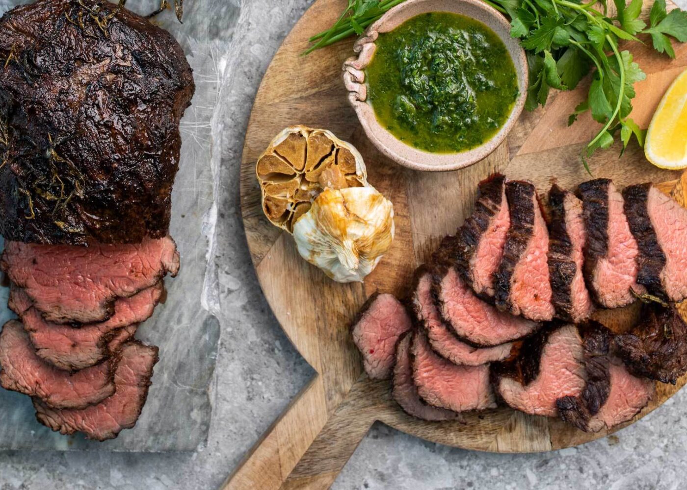 Planke med helgrillet storfe mørbrad med bakt Mont d´Or, båtpoteter, bakte hvitløk, skinkesurret asparges og chimichurri