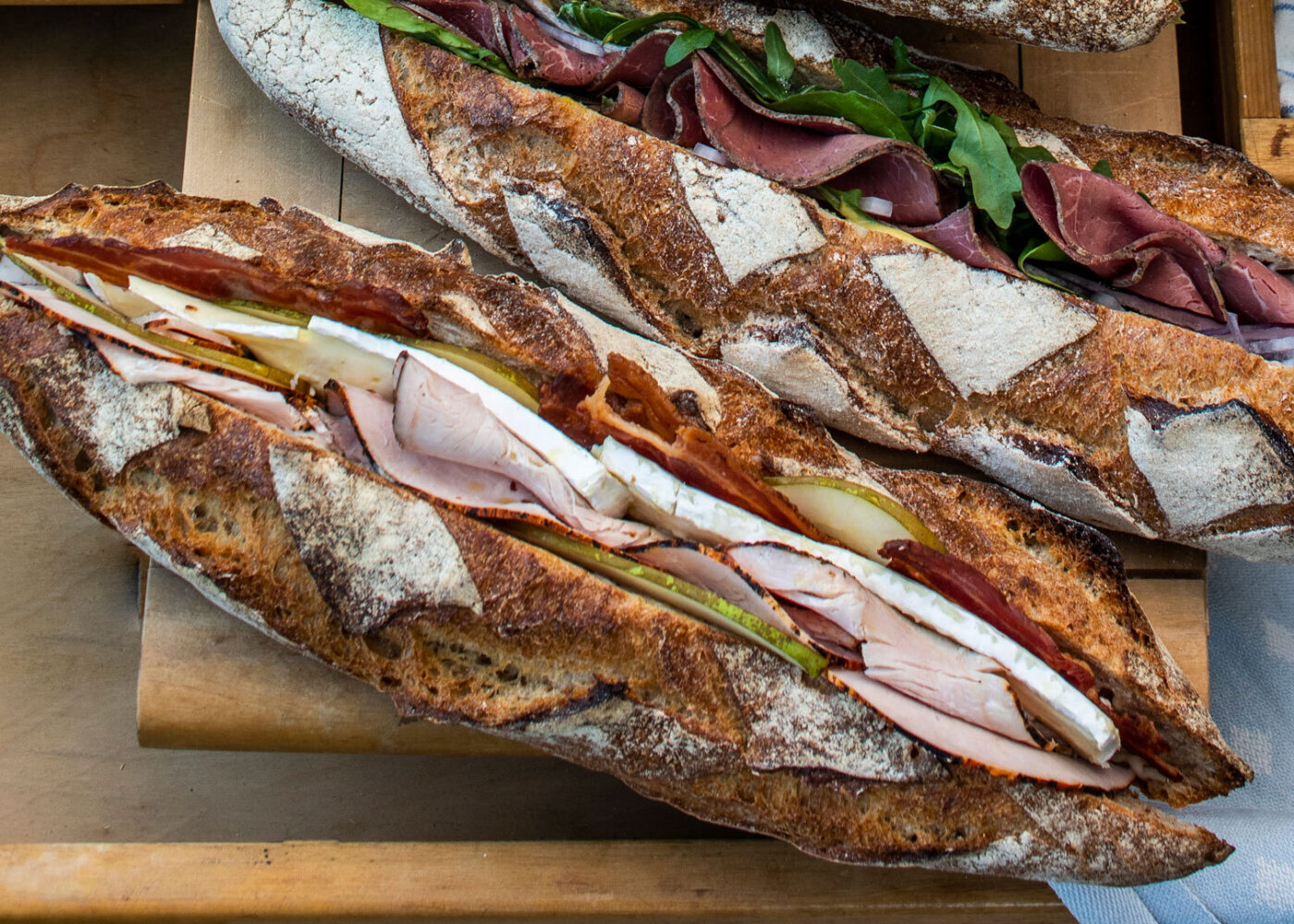 Smør bagetten med et lag dijonnaise. Legg på tynne skiver av pære, brie og stekt bacon. Fyll med kalkunfilet.
